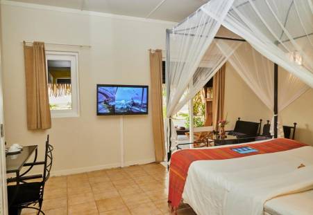В номерах для удобства имеются вентилятор, кондиционер, небольшой бар с холодильником, кофейный аппарат, телевизор, ванна и душ.